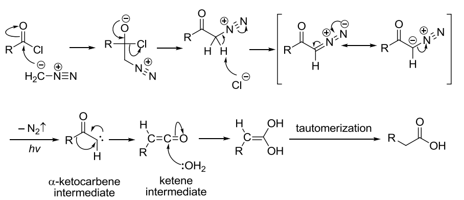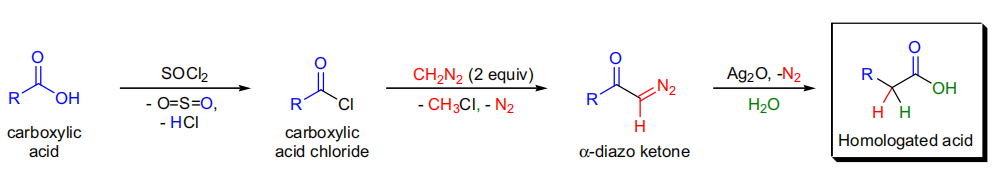羧酸经过重氮甲烷处理得到多一个碳的同系物的反应。此反应是非常好的制备多一个碳的羧酸的方法。此反应中羧酸首先转化为酰氯或活性酯,接着和重氮甲烷反应得到α-重氮甲基酮,最后进行wolff重排得到产物。