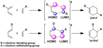 带有给电子基团的双烯体和带有吸电子基团的亲双烯体进行反应。因为前沿轨道(双烯的HOMO和亲双烯体的LUMO)的能量差越小,能够使轨道相互作用而稳定,从而使反应更容易进行(电子要求型)。同理,亲双烯体带有给电子基,共轭双烯带吸电子基的反应也容易进行(反电子要求型)。