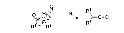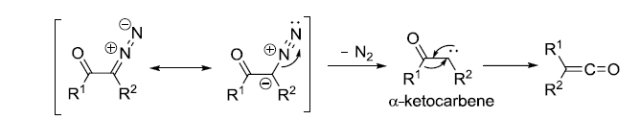 α-重氮酮重排得到烯酮的反应。烯酮是非常重要的有机中间体。可以和水反应制备羧酸,和醇反应制备酯,和胺反应制备酰胺